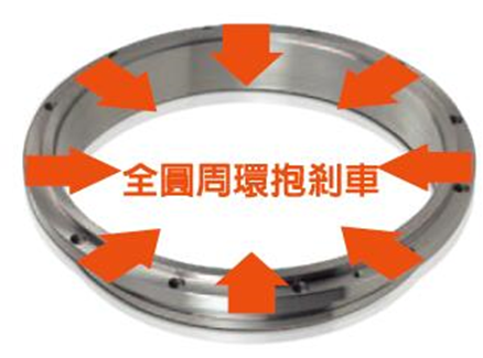 環(huán)抱式剎車環(huán)安裝在出力軸上,通過(guò)液壓壓力使剎車面變形,接觸面積大。